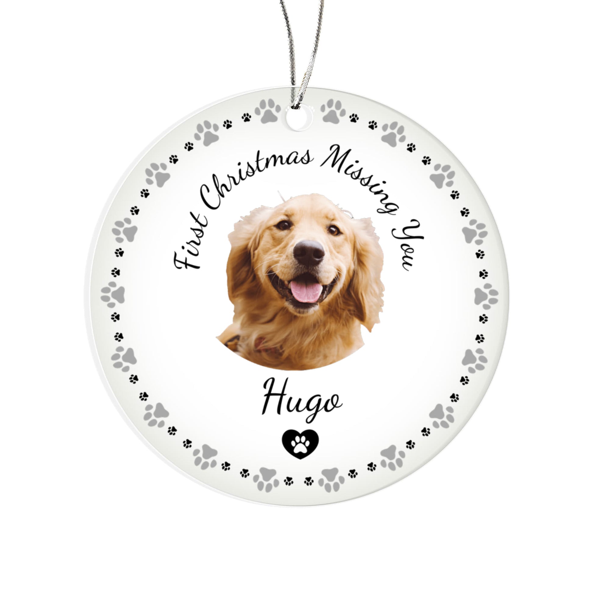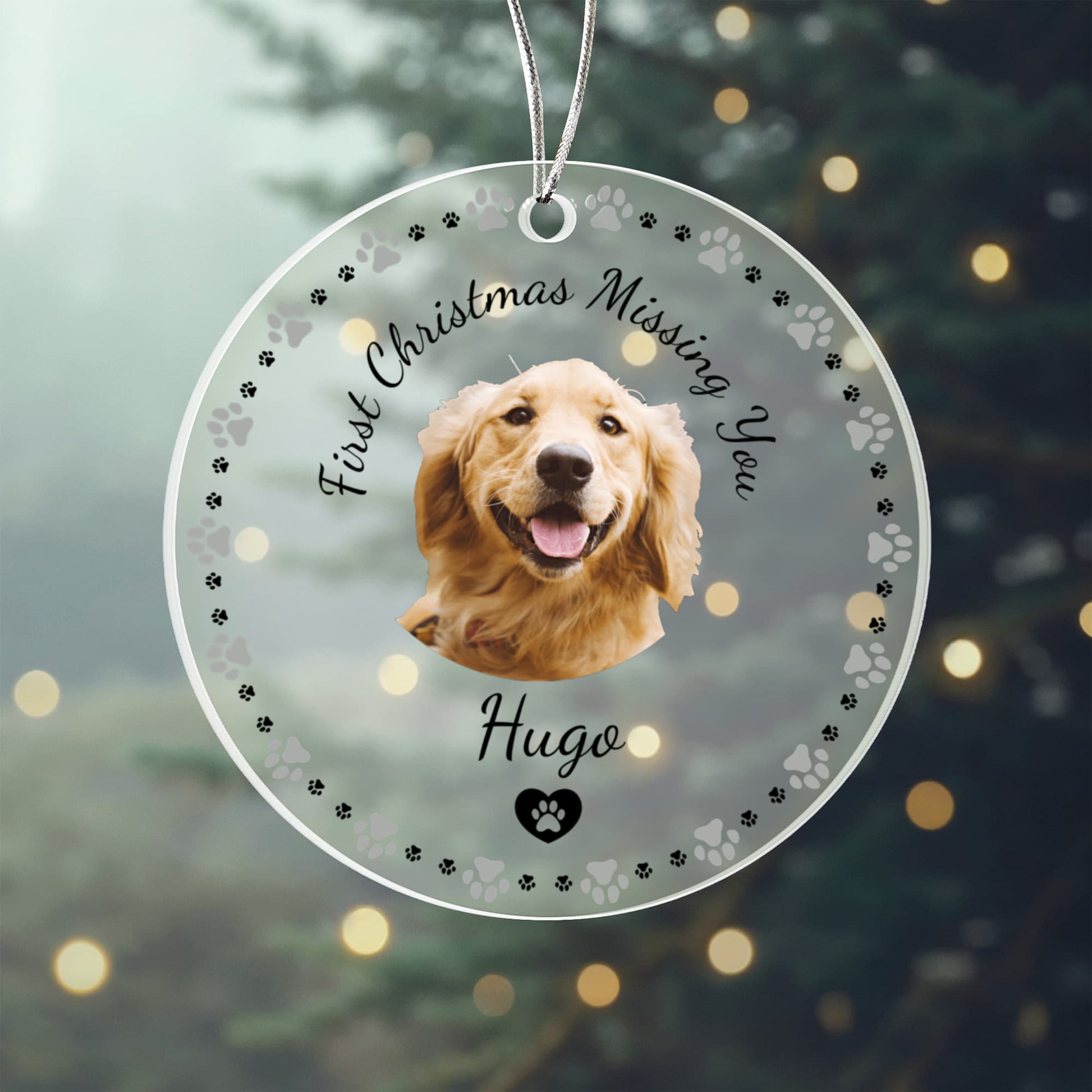 Honor the memory of a beloved pet with this custom-made acrylic round Christmas ornament — a heartfelt keepsake designed to bring comfort during a difficult first holiday season.