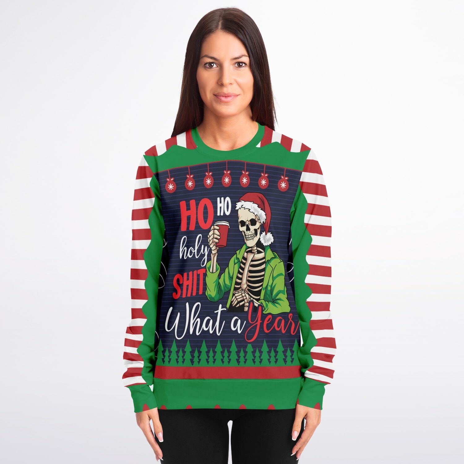 Celebrate the end of a wild year with the “Ho Ho Holy Shit What A Year” ugly Christmas sweater!