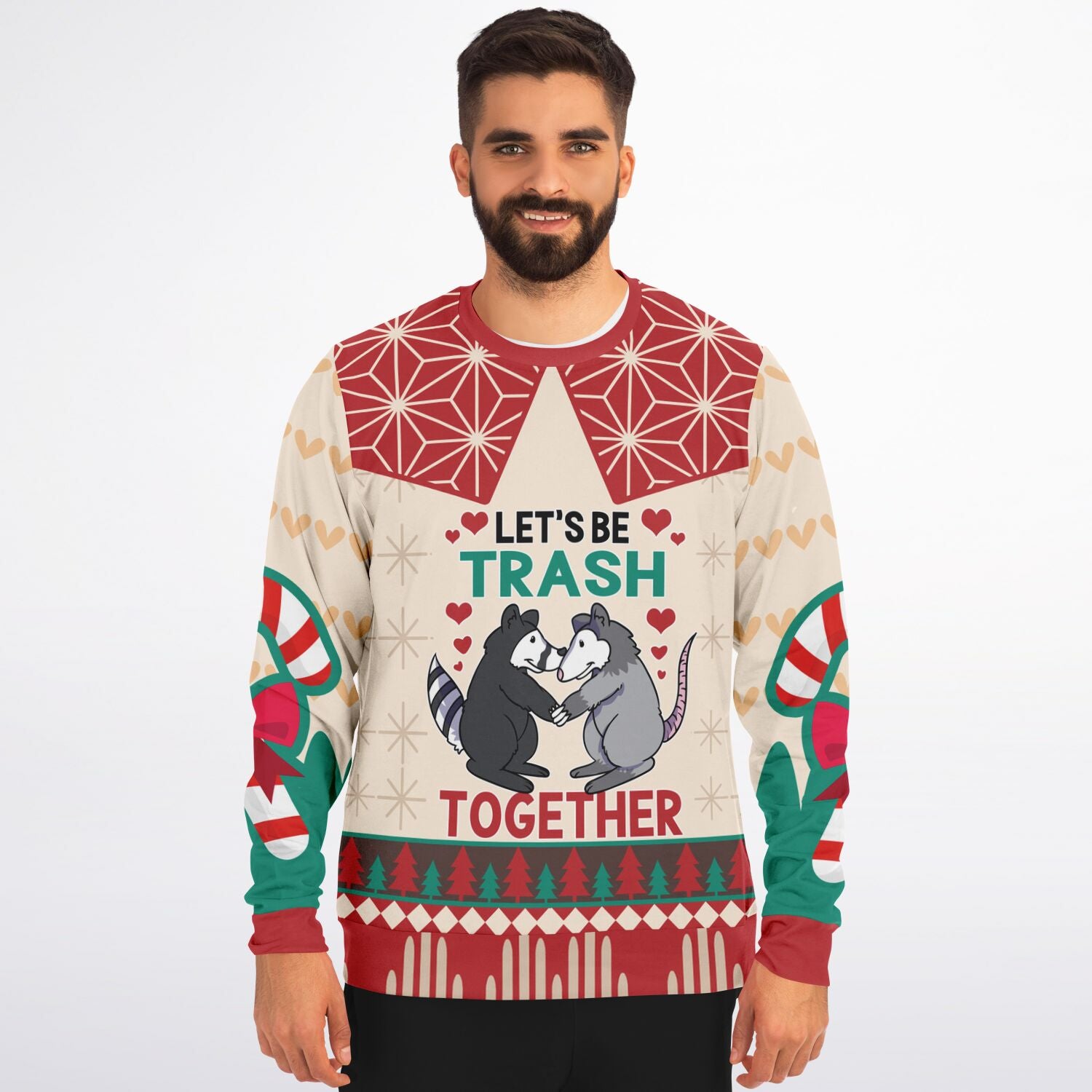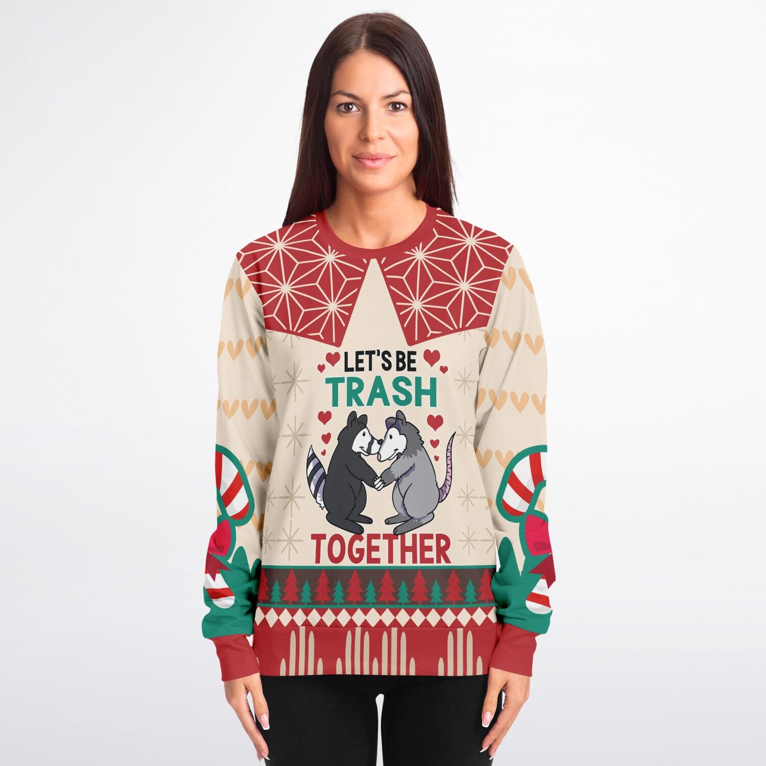 Celebrate love with a quirky twist in this adorable “Let’s Be Trash Together” ugly Christmas sweater.