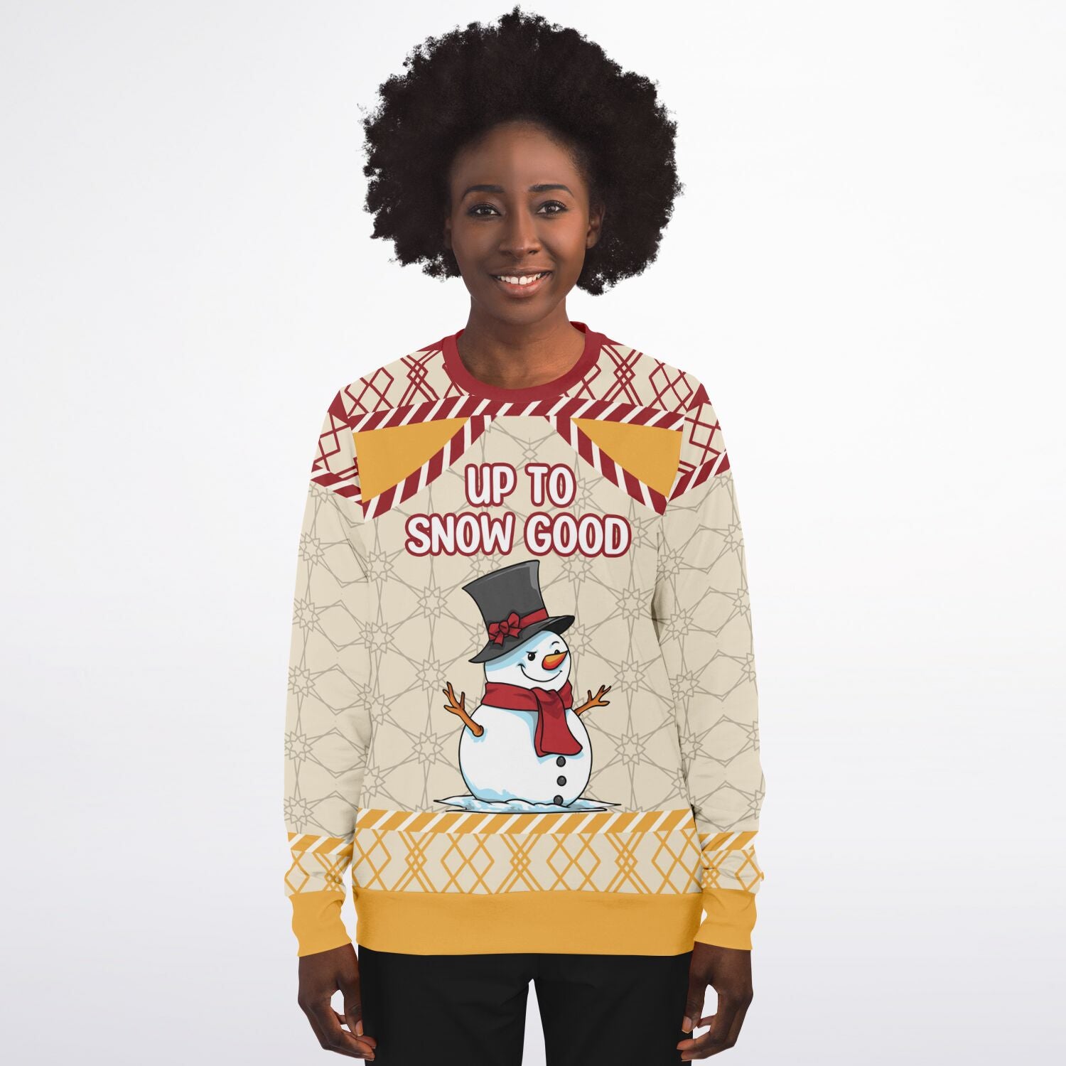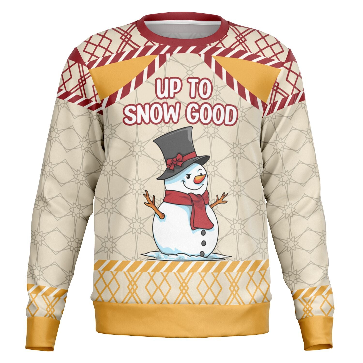Get into mischief this holiday season with the “Up to Snow Good” ugly Christmas sweater. A great gift for those who love snow puns and want to show off their fun side during the holidays!Made with 95% Recycled Polyester / 5% Spandex.