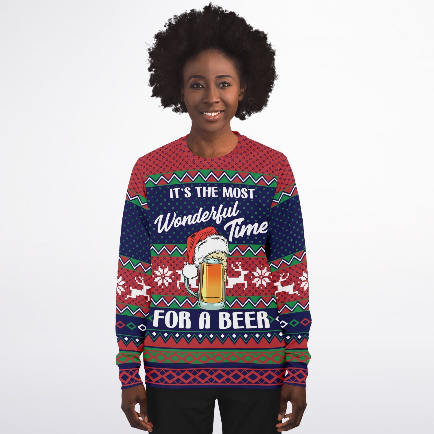 Turn heads this holiday season with a Wonderful time for a beer ugly Christmas sweater! The perfect piece for office parties, family get-togethers, or your next ugly sweater contest.